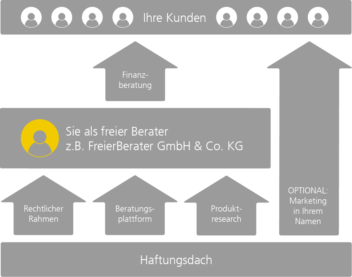Ein Haftungsdach gibt Ihnen die Freiheit, Ihrem Kundenkreis den von Ihnen entwickelten und gelebten Beratungsumfang und Ihr persönliches Serviceverständnis nahe zu bringen. Sie erhalten unter dem Haftungsdach die informative, rechtliche und technische Plattform für Ihre Tätigkeit. Sie profitieren besonders von dem regulatorischen Rahmen, denn ohne Kreditwesengesetz (KWG) oder Wertpapierinstitutsgesetz (WpIG) Lizenz können Sie Finanzinstrumente nicht vermitteln.